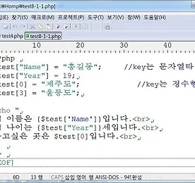 collectiom 썸네일형 리스트형 8. PHP 배열 8. PHP언어의 배열 표시법에 대하여 알아 봅시다. 배열형은 대괄호나 , array()함수를 사용하여 표기합니다. 1. 대괄호 표기법 형식) $배열명[key] = value; key는 정수형 타입이나 문자열 타입이어야 합니다 다음 예제에서는 $test 라는 배열명을 사용하여 배열을 지정하였습니다. 배열의 키는 문자와 숫자를 사용하였습니다. 키가 문자일 때는 이중따옴표(")나 따옴표(')로 문자를 둘러 싸서 표기합니다. test8-1-1.php 더보기 이전 1 다음